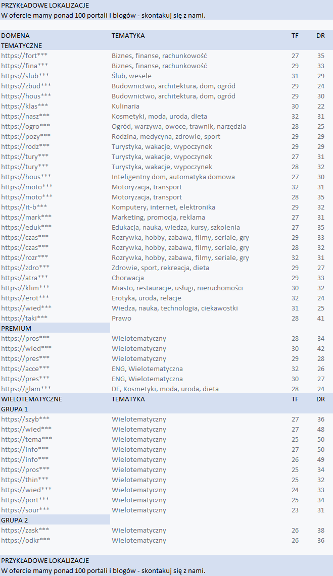 Sprawdź przygotowane przez nas lokalizacje i wykorzystaj je w swoim procesie pozycjonowania lub prześlij do nas zapytanie o propozycje linkowania. Jak to działa? Możesz samodzielnie wybrać portale i blogi w których opublikujemy przesłane przez Ciebie artykuły lub treści przygotowane przez nas. Jeśli nie chcesz wybierać portali napisz do nas wiadomość uwzględniającą adres strony – w odpowiedzi prześlemy naszą propozycję domen pod mocne linki z artykułów sponsorowanych. W zapytaniu warto uwzględnić również budżet na linki – dopasujemy do niego ilość publikacji.